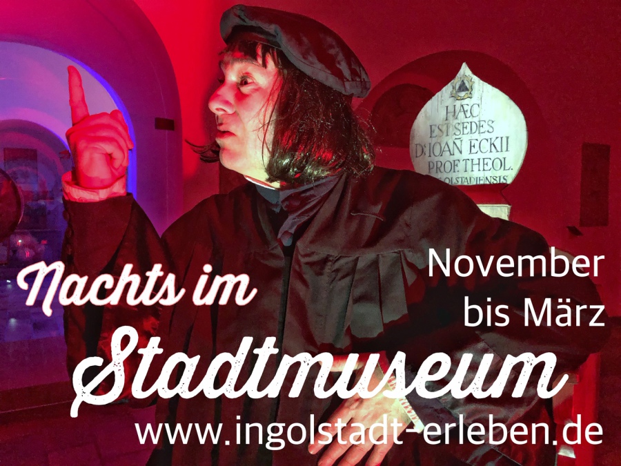 Wenn im Stadtmuseum abends die Lichter ausgehen, wird Lokalgeschichte lebendig. Im Schein der Taschenlampe können die Besucher eine Zeitreise antreten und begegnen dabei einer ganzen Reihe prominenter Ingolstädter aus der Vergangenheit.